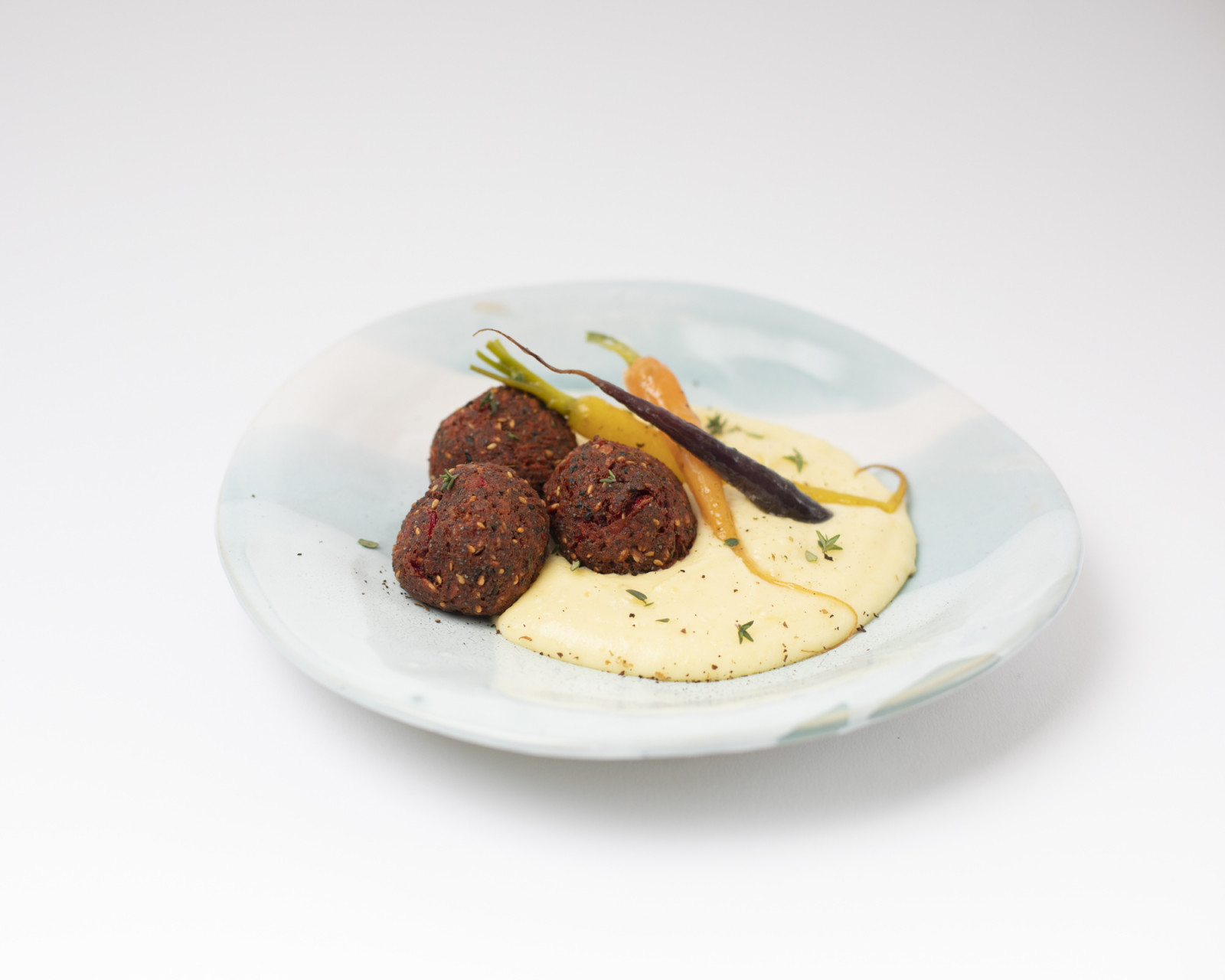 Crème de pois chiches, betteraves rôties, pleurotes marinées snackées, rhubarbe.